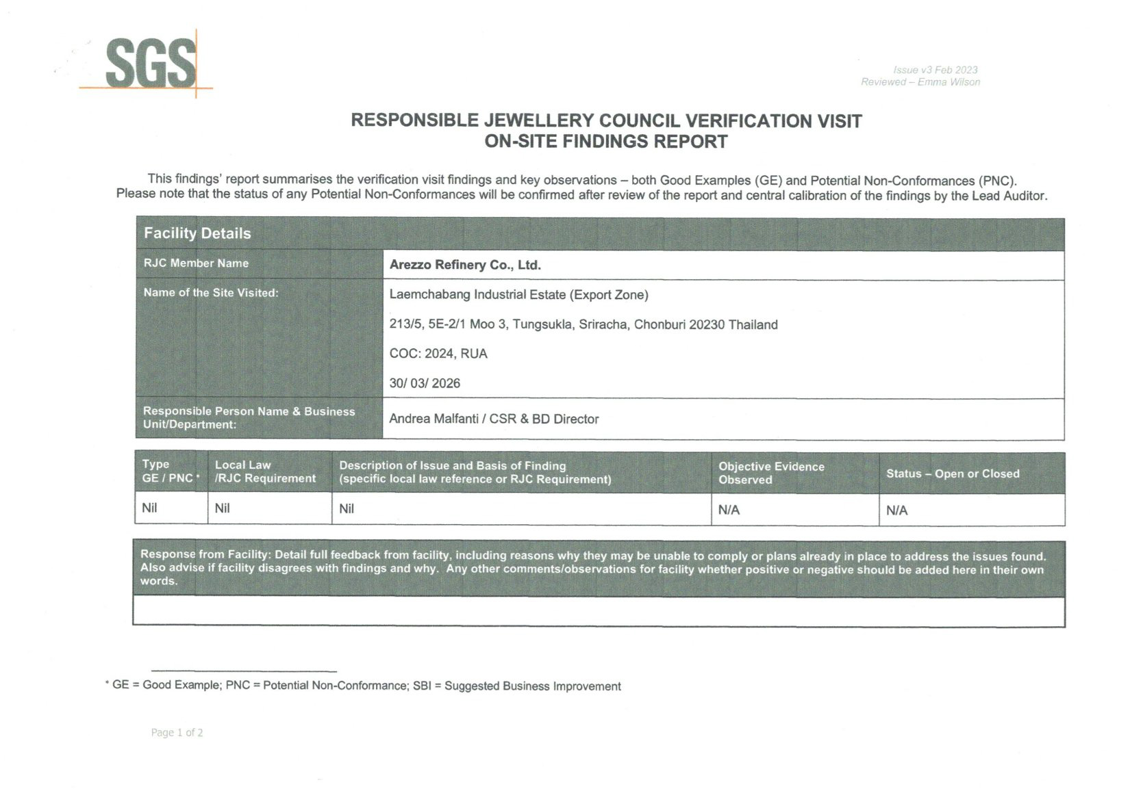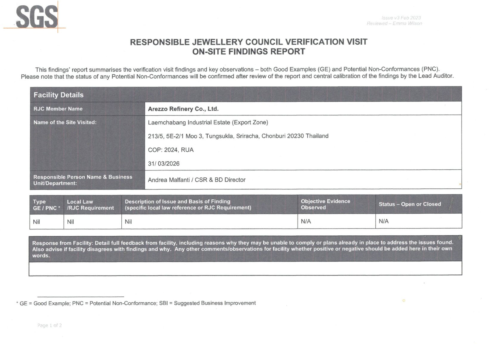 Arezzo Refinery Co.,Ltd is a certified company of RJC that is positively helping to transform the supply chains to be more responsible and sustainable – by catalysing partnerships, underpinning trust in the globle jewellery and watch industry and securing a future that can be treasured for generations to come.